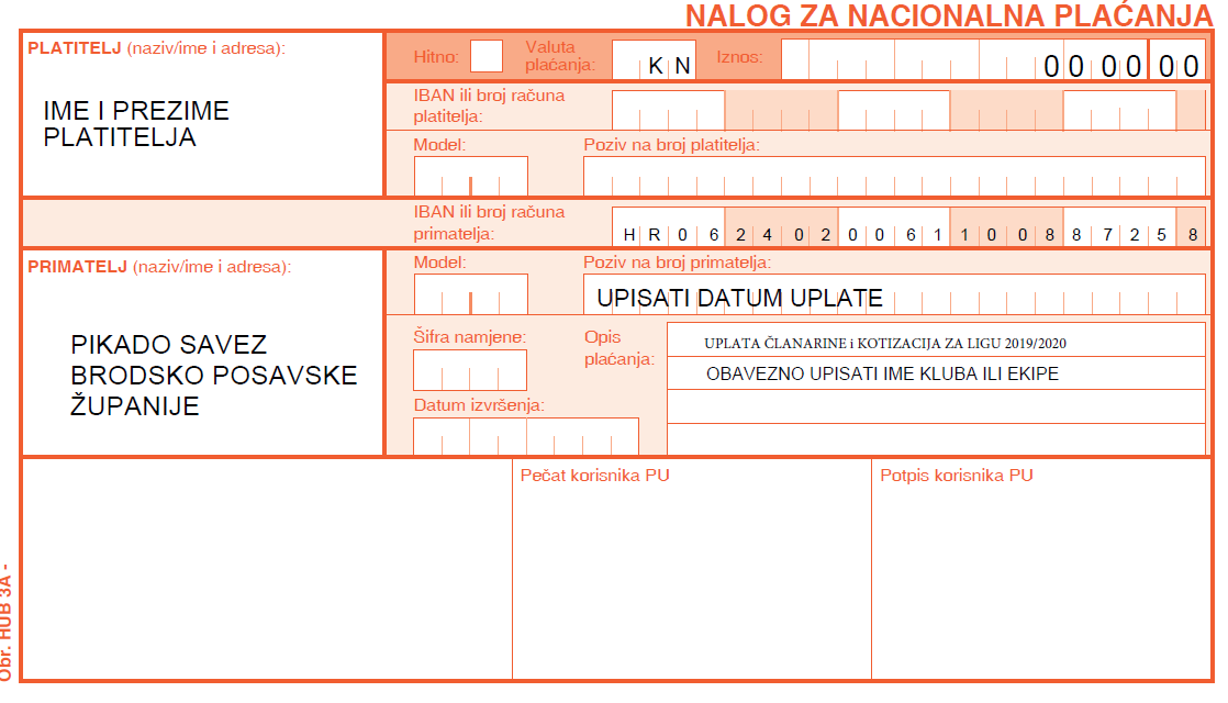 Primjer: ako prijavljujete 6 igrača (6 x 150,00 kn) + 100,00kn članarina - ukupni iznos na uplatnici je 1.000,00 kn