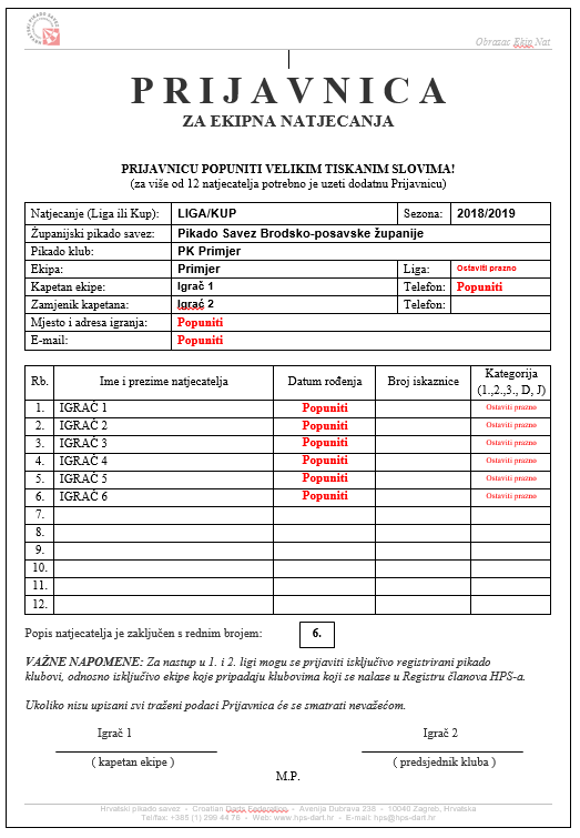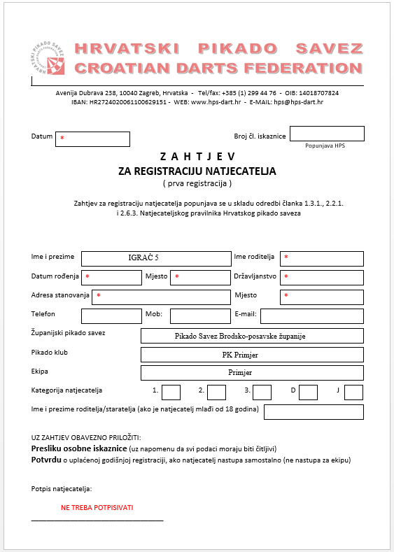 Drugo je zahtjev za registraciju natjecatelja koju je potrebno ispuniti za svakog igrača navedenog na gornjoj prijavnici (u ovome primjeru za 6 igrača)