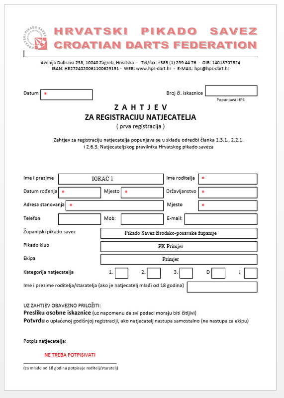 Prijavnicu/registraciju za svakog natjecatelja također dostaviti u digitalnom obliku i ne ispunjavati rukom (potpis nije potreban jer ide preslika osobne iskaznice uz registraciju)